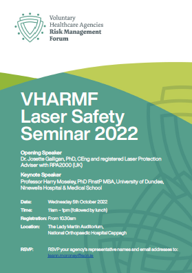 Delighted to have been asked to give the opening talk at the Voluntary Healthcare Agencies Risk Management Forum’s (VHARMF) Laser Safety Seminar, hosted by AON, and to talk about the minimum laser safety requirements under the Health and Safety Legislation, which I like to call the ‘Triad of Safety’.